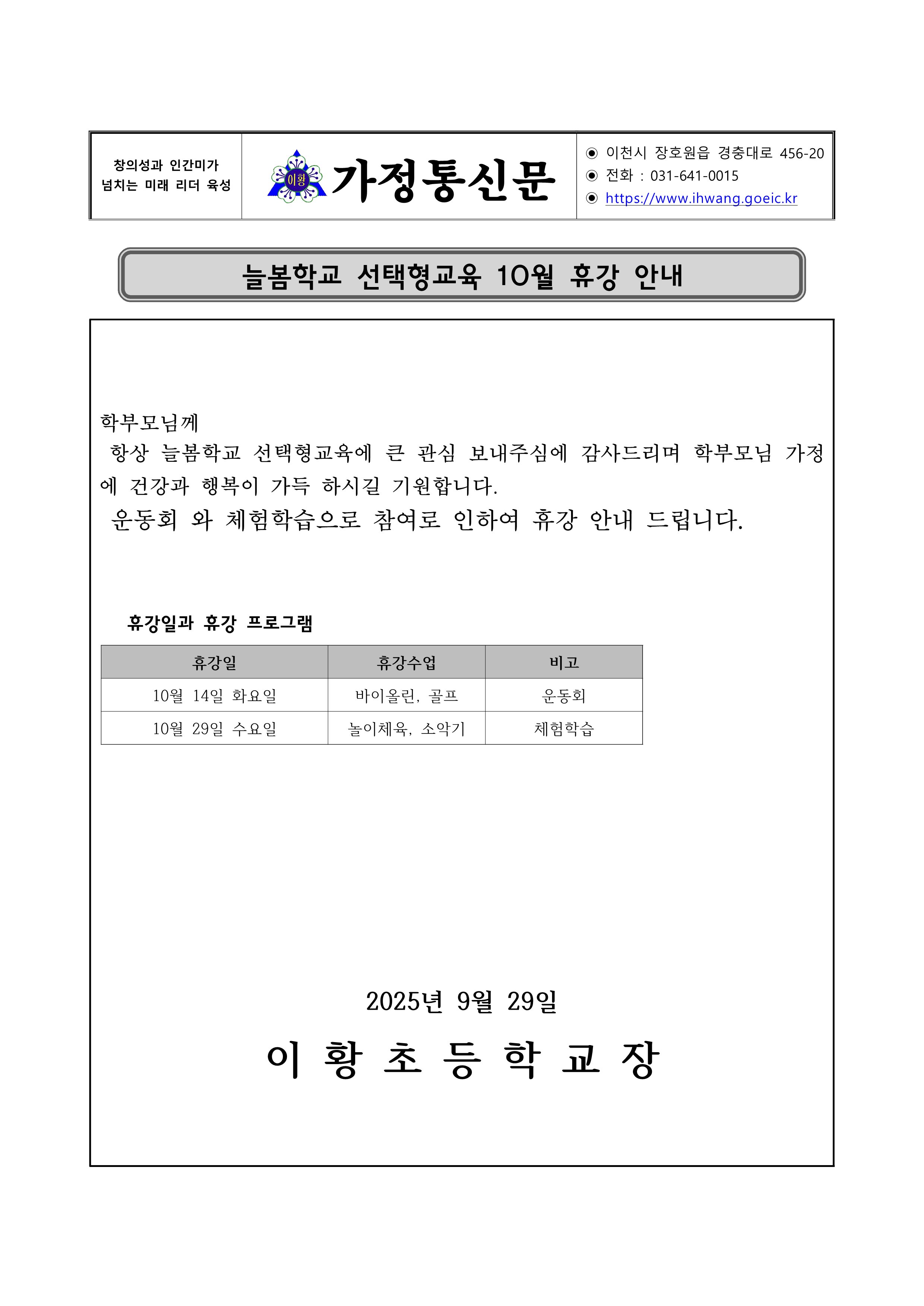 늘봄학교 선택형교육 10월 휴강안내